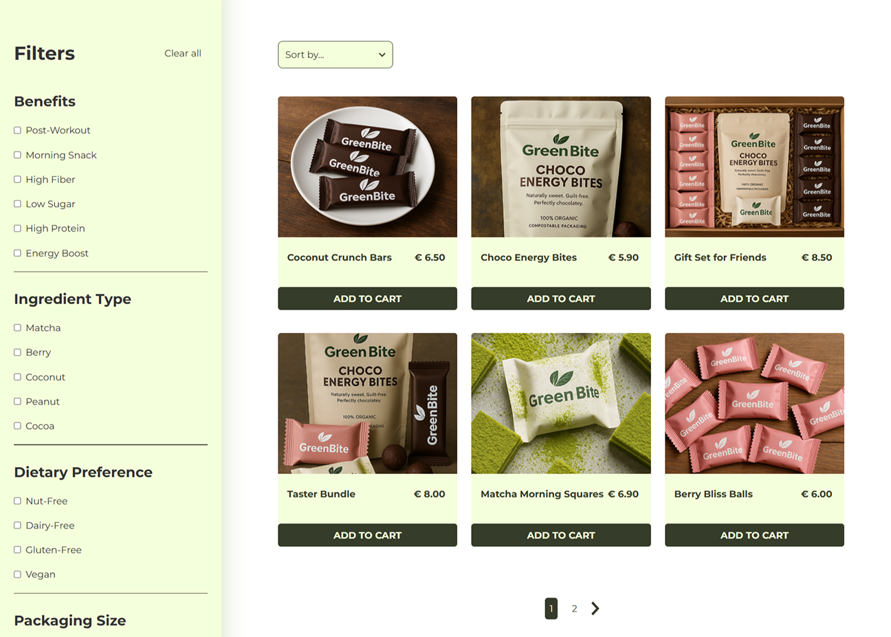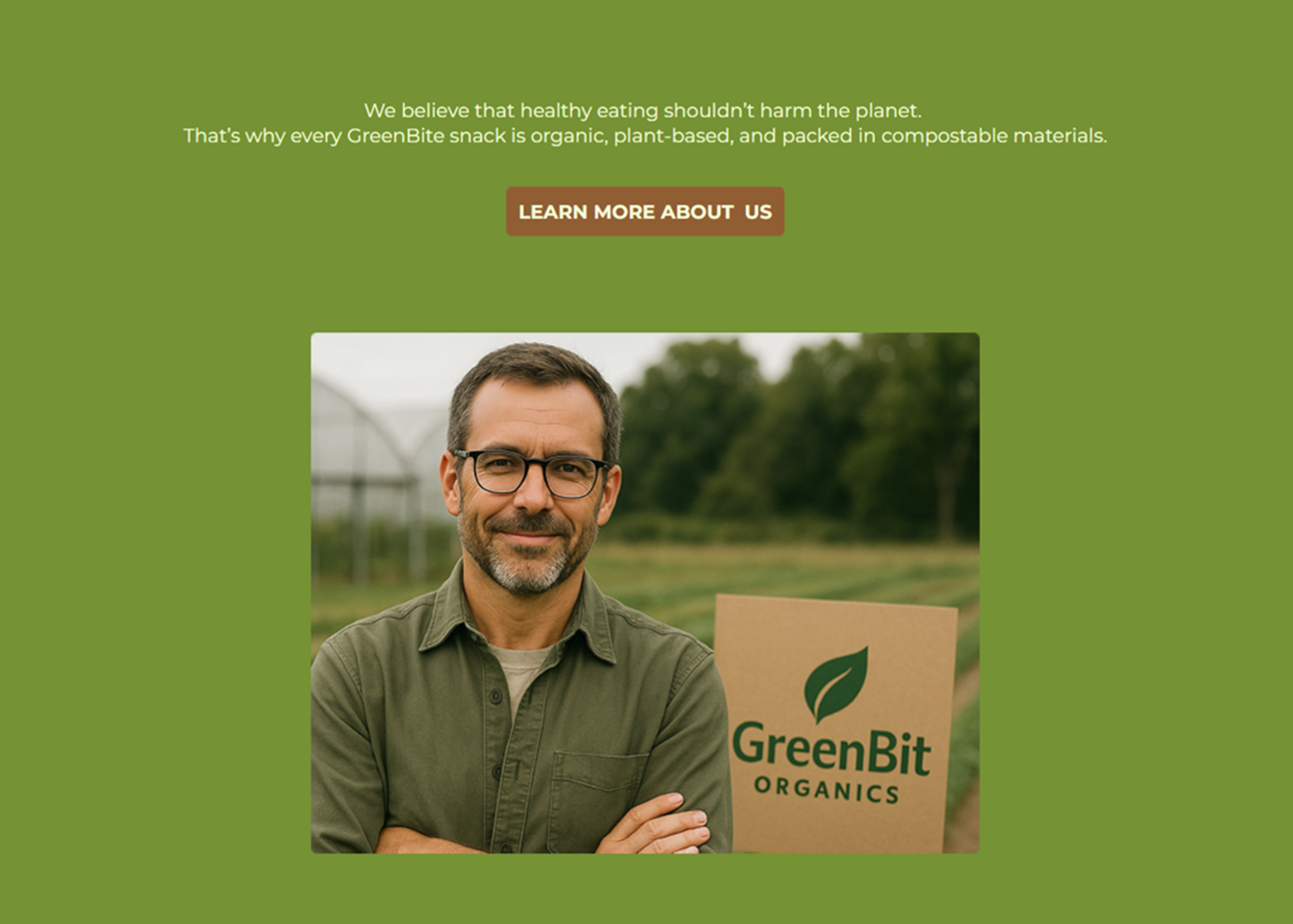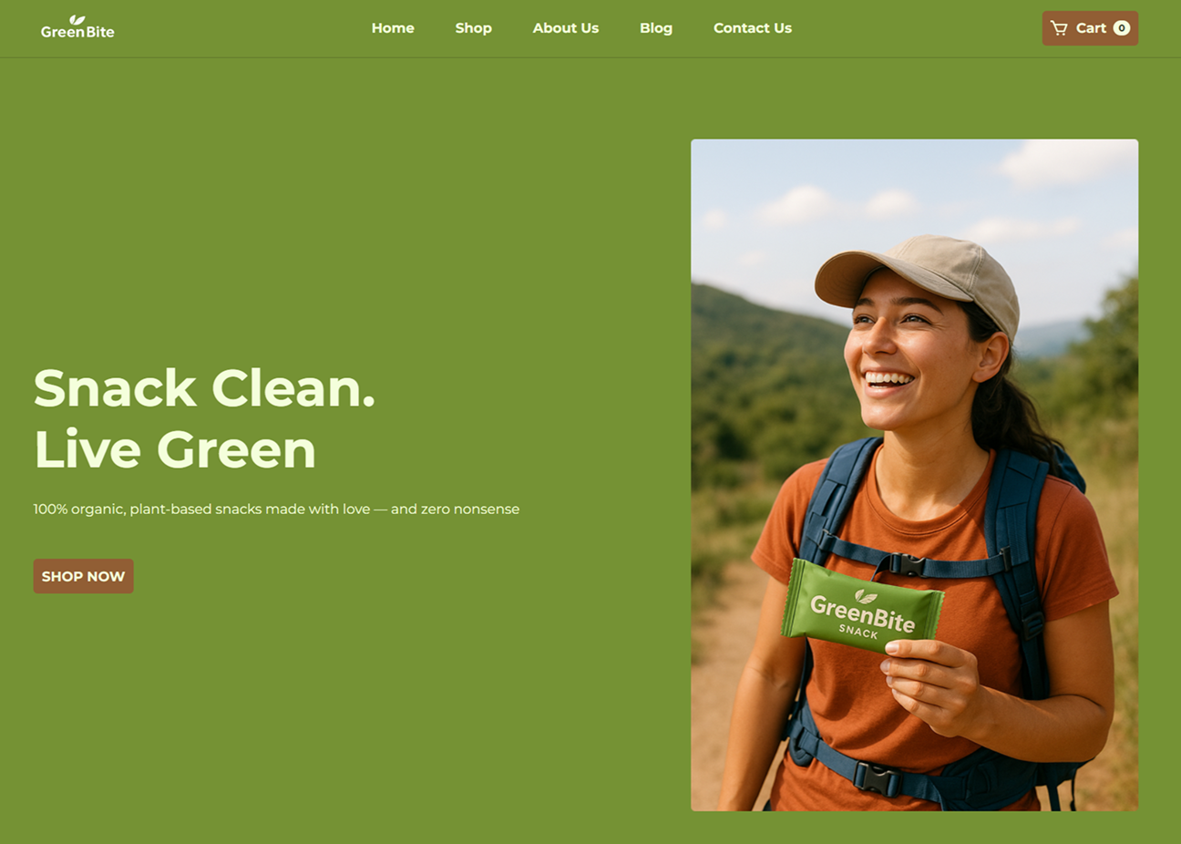 Green Bite Organics is a sustainable food brand that sells plant-based snacks and natural supplements. Their main audience is eco-conscious millennials aged 25–40 who value transparency, organic ingredients, and modern design aesthetics.
