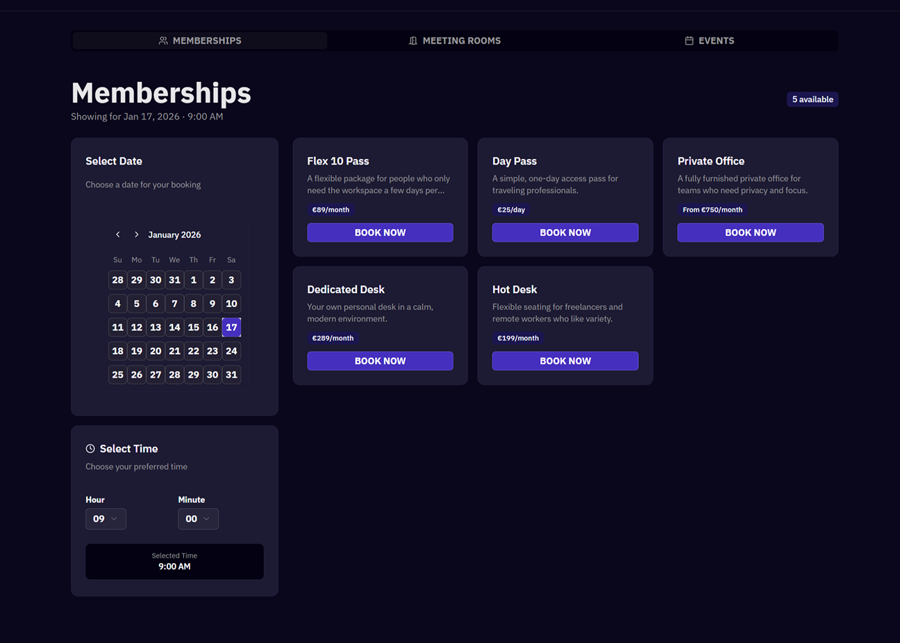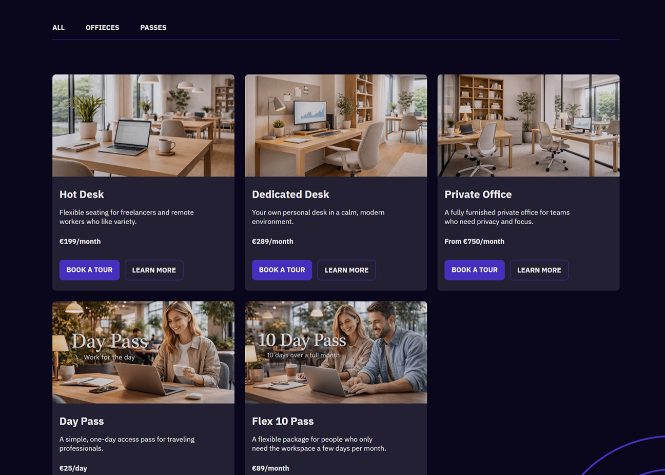 I developed the site's seven main pages (Home, Memberships, Meeting rooms, Events, Gallery, Book a tour) per a client's request. The entire website is simple to use. All of the client's offer details are readily available to customers on the home page. I added filtering to other pages so that clients could easily find the service they wanted. Using Webflow app-gen, I create a booking app that lets users reserve events, memberships, and meeting rooms.
